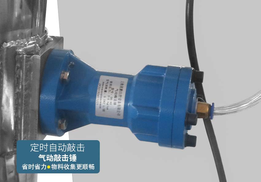 二代超微粉碎机组增设空气锤,很多沙克龙收集器都会产生物料粘壁,回收不畅的情况,需要人工去敲击震落,不但增加了劳动量,还会造成沙克龙的外观变形,影响美观和物料收集。二代超微粉碎机组在沙克龙外体增设空气锤,定时的自动敲击,使物料收集更顺畅,省时省力。